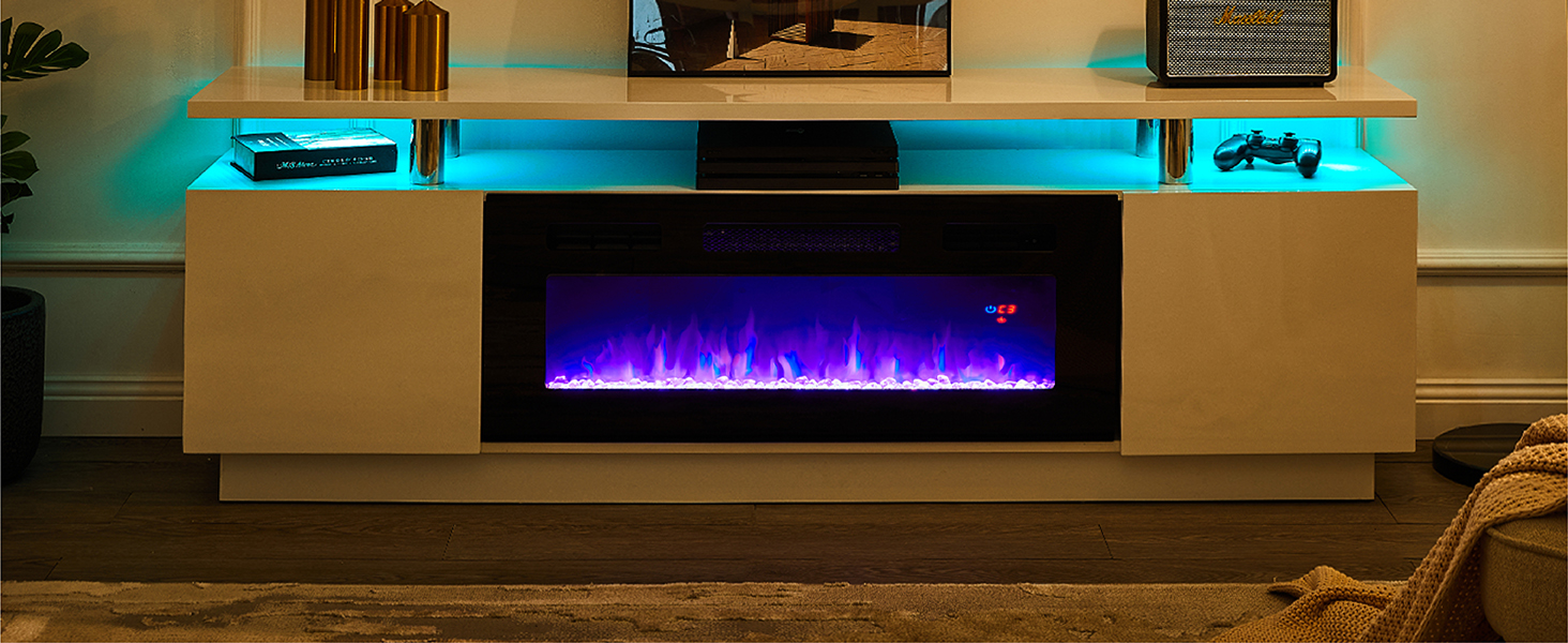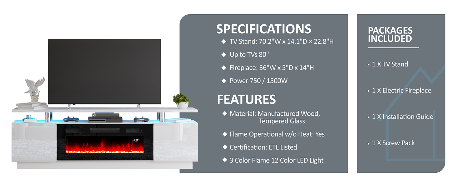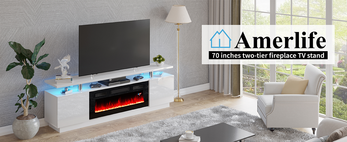 Brand AMERLIFE Power Source Corded Electric Product Dimensions 14.4"D x 70.2"W x 22.6"H Material Engineered Wood Finish Type High Gloss & Matte white Installation Type Freestanding Heat Output 5100 British Thermal Units Special Feature 70" Modern High Gloss, Adjustable Flame&LED, Temperature Control & Time Setting, 36" Electric Fireplace, 2 Tier Design Style Modern Color White & Black Room Type Living Room, Bedroom, Home Office Included Components Tv stand, Fireplace Item Weight 111 Pounds Model Name Large Storage Fireplace TV Stand Shape Rectangular Power Consumption 1500 Watts Chamber Depth 5 Inches Burner type Electric Item Weight 111 pounds ASIN B0BCY1DBWK Item model number FTS5351 Manufacturer AMERLIFE