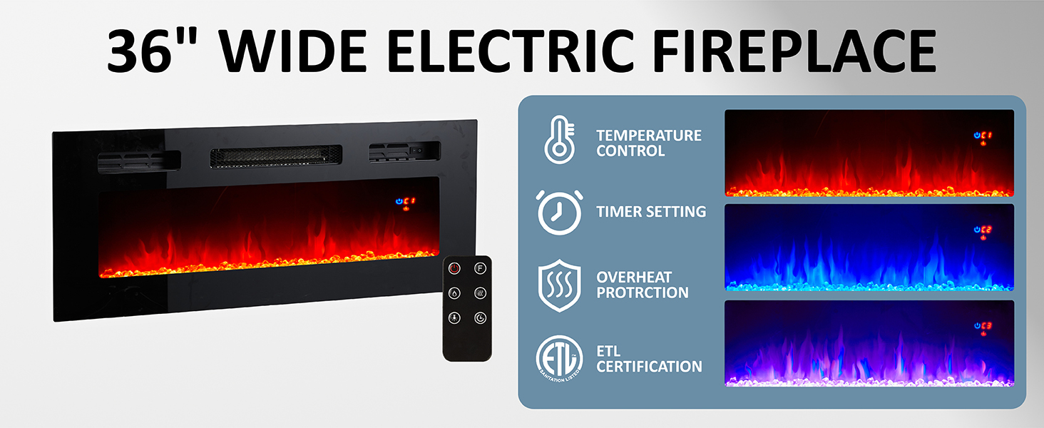 - 36" wide modern electric fireplace features 3 color realistic flame&5 level brightness,temperature control and time setting.750W/1500W Power heats quicker & energy efficient for max 4800 BTU output.Remote control included