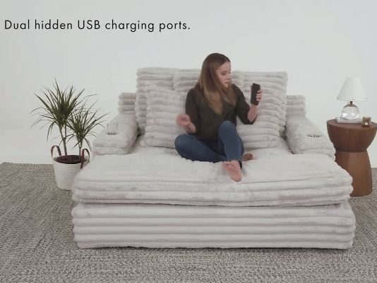 The Grand dove chaise lounge is the perfect addition to your living room for ultimate relaxation. Its ultra-dense, soft luxurious feel is made with wide, super soft corduroy fabric that is both durable and stylish. The chaise lounge has a lofty appearance and is accompanied by three back pillows and two down filled toss pillows for added comfort. With two USB ports, you can conveniently charge your electronic devices while lounging. And with two cupholders, you can easily enjoy your favorite beverage without having to get up. Whether you are watching a movie or reading a book, the Grand Dove Chaise Lounge is the perfect spot to unwind and relax.